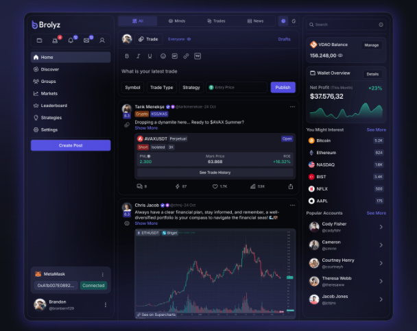 Brolyz, Vestra DAO’nun ana ürünü ve SocialFi tabanlı sosyal analiz platformudur. İsmini “Brokers” (aracılar) ve “Analyze” (analiz) kelimelerinin birleşiminden alır.