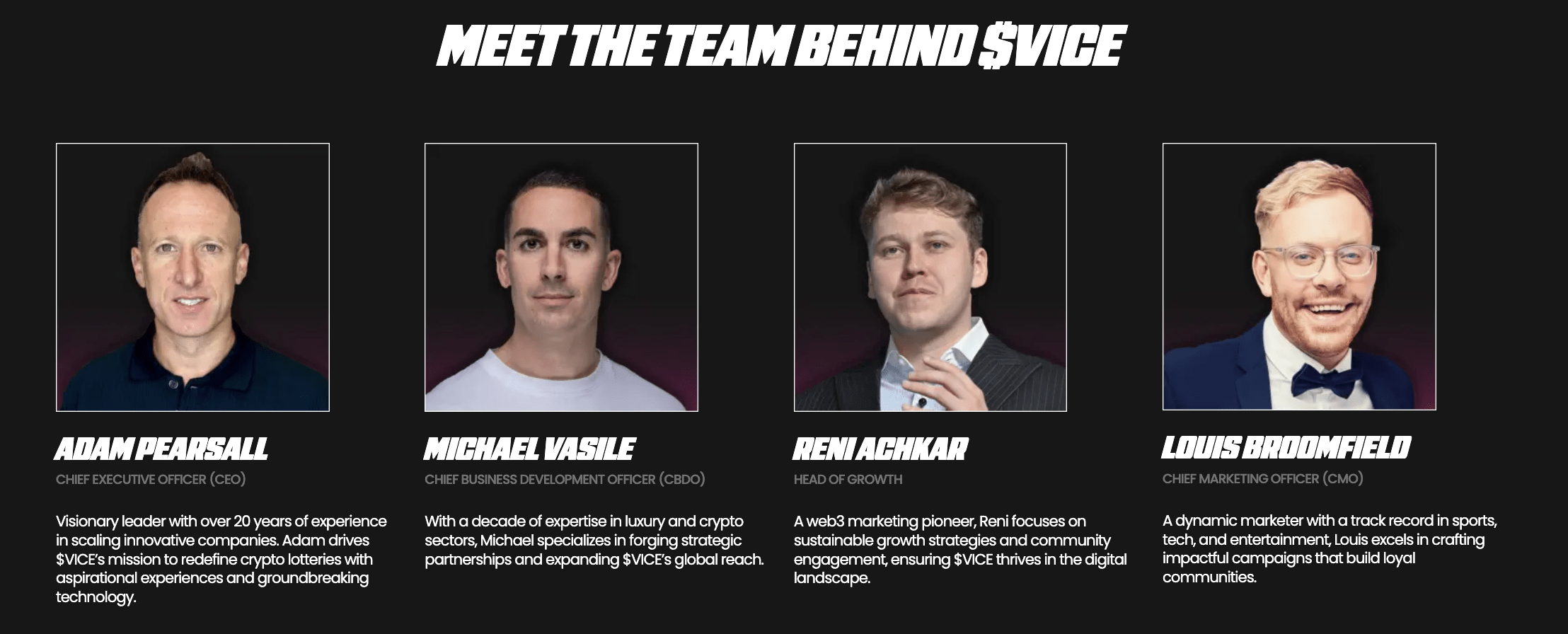 VICE ekibi, deneyimli profesyonellerden oluşur: Adam Pearsall CEO olarak liderlik eder, Michael Vasile CBDO olarak iş geliştirme sorumluluğunu üstlenir, Reni Achkar büyüme başkanı olarak genişlemeyi yönetir ve Louis Broomfield CMO olarak pazarlama stratejilerini şekillendirir.