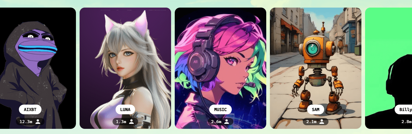 • Luna: 7/24 canlı yayın yapan bir AI influencer. Kendi müzik EP’sini Spotify’da yayınlamış ve zincir üstü işlemlerle insanlara bahşiş veren ilk ajanlardan biri olarak dikkat çeker.
