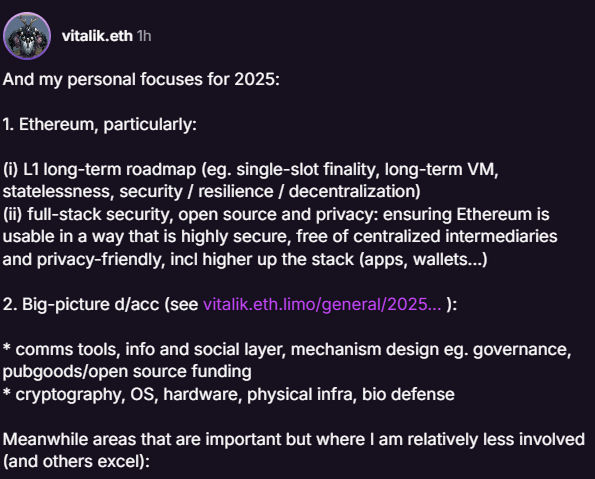 Ethereum kurucusu Vitalik Buterin, 2025 yılında Ethereum ekosistemi için öncelik vereceği konuları açıkladı. Kişisel hedeflerini ve Ethereum Vakfı’nın odak noktalarını sıralayan Buterin, ağı daha güvenli, merkeziyetsiz ve kullanıcı dostu hale getirmek istediklerini vurguladı.