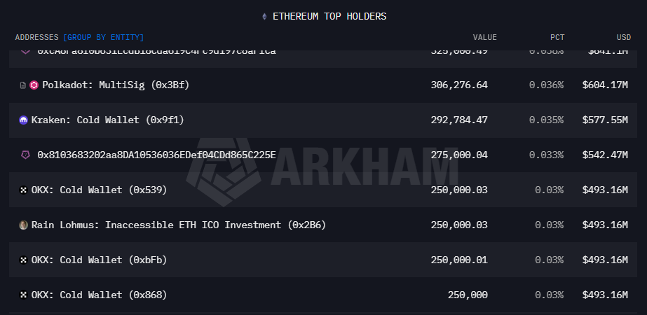 Bireysel sahipler arasında Vitalik Buterin öne çıkıyor. Erken dönem yatırımcılardan Rain Lohmus’un yaklaşık 250.000 ETH’si bulunuyor, ancak cüzdan anahtarlarını kaybettiğini açıklamıştı. Bu nedenle pratikte erişilebilen en büyük bireysel ETH varlıklarından biri hâlâ Buterin’in kontrolünde görünüyor.