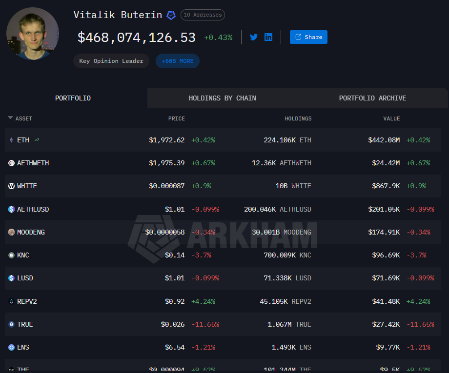 likEthereum’un kurucusu Vitalik Buterin’in serveti yıllardır merak konusu. Zincir üstü veriler tabloyu netleştiriyor: Buterin’in kontrol ettiği bilinen cüzdanlarda 240.000’den fazla ETH var. Bu miktarın güncel değeri yaklaşık 467 milyon dolar seviyesinde. Servetin neredeyse tamamı Ethereum fiyatına bağlı; klasik anlamda çeşitlendirilmiş bir portföyden çok, tek varlığa bağlı yoğunlaşmış bir yapı söz konusu.