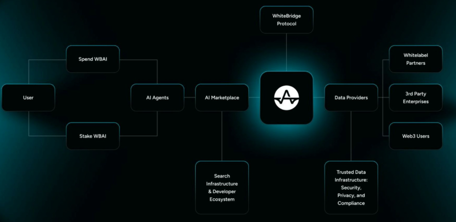 WhiteBridge, veri sağlayıcılar (düğümler), yapay zeka aracıları ve son kullanıcıları bir araya getirerek kendini sürdüren bir ekosistem oluşturur. Ağ büyüdükçe, veri ve token tabanlı geri bildirim döngüsü ile daha fazla düğüm katılımı teşvik edilir ve platform istihbarat yetenekleri güçlenir.