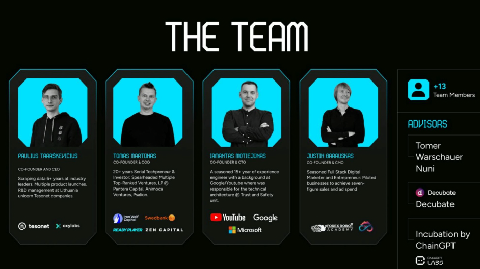 - Paulius Taraskevicius (Kurucu Ortak ve CEO): Sektör liderlerinde 6 yıldan fazla veri kazıma deneyimi, birden fazla ürün lansmanı ve Litvanyalı unicorn Tesonet şirketlerinde Ar-Ge yönetimi.