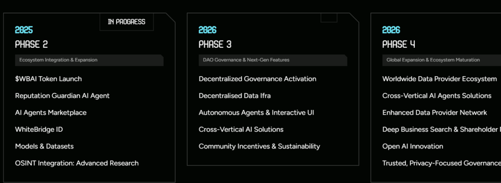 Aşama 2 – Ekosistem Entegrasyonu: WBAI token lansmanı, stake etme özellikleri, AI Agent ve WhiteBridge kimliği oluşturuldu.
