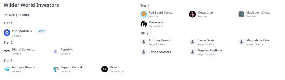 Wilder World, toplamda 33 milyon dolar fon toplayan bir metaverse platformu olup, önde gelen yatırımcılar tarafından desteklenmektedir. Tier 1 seviyesinde The Spartan Group, Tier 2’de Digital Currency Group (DCG) ve Republic, Tier 3’te Animoca Brands, Signum Capital ve Nexo, Tier 4’te ise Red Beard Ventures, Metapurse, Maelstrom Interactive ve Metaversal gibi venture ve kurumsal yatırımcılar yer alıyor. Ayrıca, Anthony Pompliano, Baron Davis, Magdalena Kala, Rovida Advisors ve Stephen Pagliuca gibi bireysel melek yatırımcılar da projeye katkıda bulunmaktadır.