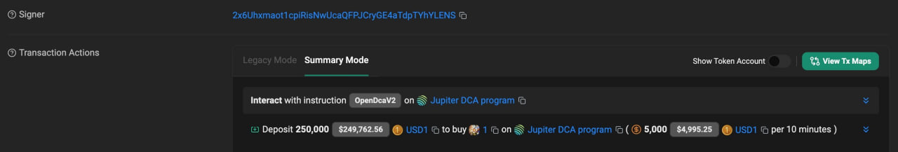 On-chain analiz verilerine göre, WLFI ekibine ait resmi bir cüzdan, “1 (1 Coin Can Change Your Life)” adlı token için 250.000 dolarlık DCA (dolar maliyeti ortalaması) yatırım planı başlattı. Bu hamle, ekibin tokena olan güvenini açıkça ortaya koyarken, piyasanın dalgalı yapısına karşı dengeli ve sistematik bir birikim stratejisi yürütüldüğünü gösteriyor.