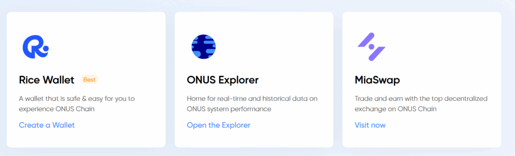 ONUS Chain, kullanıcı dostu cüzdanlar, staking sistemleri, RPC-API ve EVM uyumlu akıllı sözleşmeler ile tam bir Web3 & DeFi ekosistemi sunar. Rice Wallet ve diğer partner uygulamalar ekosistemin aktif kullanımını sağlar.