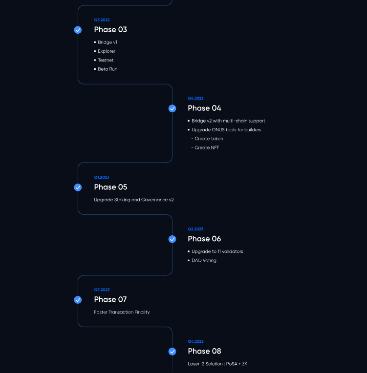 • 2022 Q4 (Faz 04): Çoklu zincir desteği, ONUS araçları güncellendi; token ve NFT oluşturma eklendi.