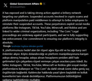 X’in resmi açıklamasına göre, kötü niyetli gruplar askıya alınan kripto odaklı hesaplarını yeniden aktif hale getirebilmek için doğrudan platformun resmi kanallarını kullanmak yerine aracı kişiler üzerinden hareket etti. Bu aracılar, X’in içeriden bazı çalışanlarıyla temas kurarak para karşılığı hesapların yeniden açılmasını teklif etti.