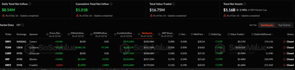 Ancak momentum hızlı şekilde yavaşladı. 11 Aralık haftasında net giriş 93,57 milyon dolara geriledi. Ve 16 Aralık haftasında yalnızca 19,44 milyon dolar eklendi. Yani “altı haftalık giriş” tabloyu gösterse de trend soğuyor. ETF talebi hâlâ pozitif, ancak hızlanmıyor. Bu yavaşlama, XRP fiyatının ETF girişlerinin güçlü olduğu ilk haftalardaki seviyeleri takip edememesini açıklıyor.