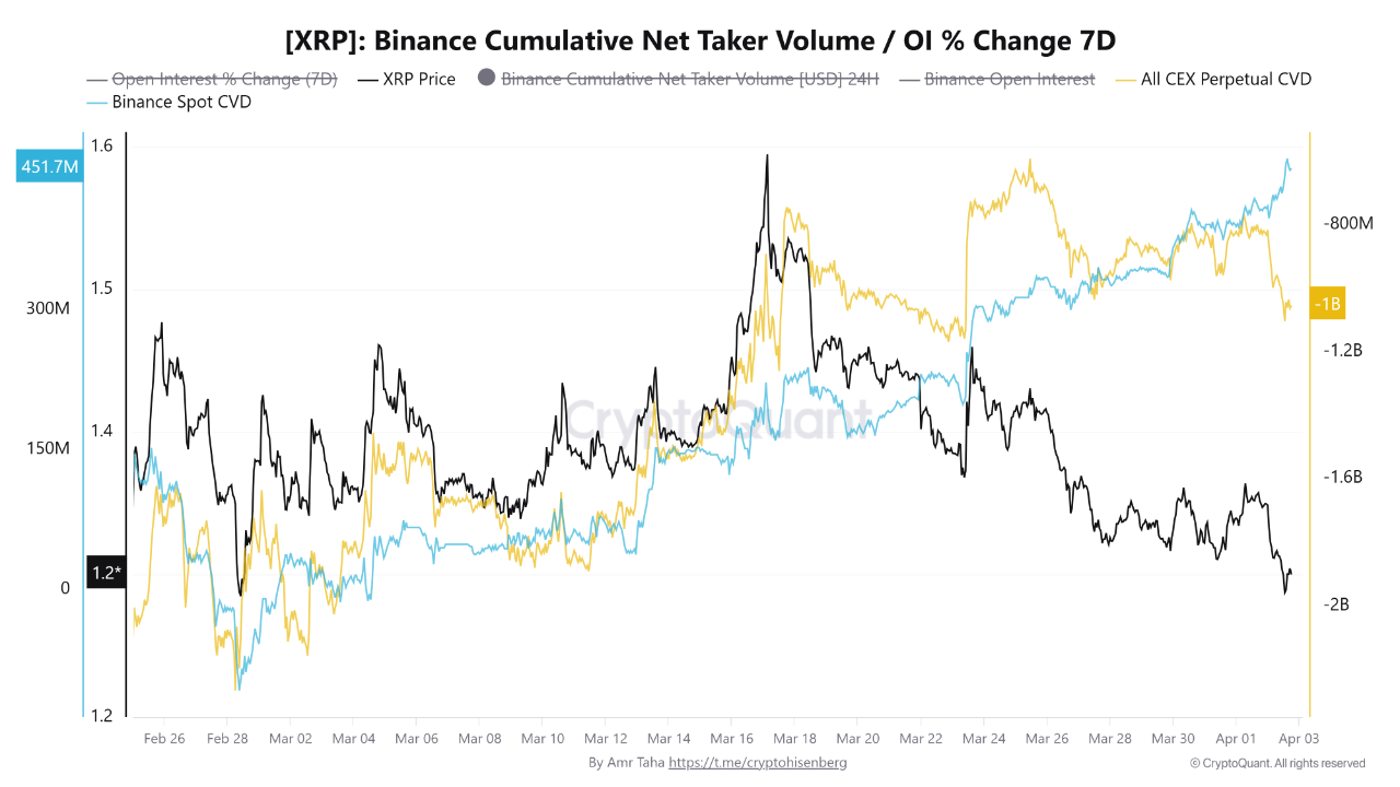 On-chain ve borsa verileri, spot piyasada ciddi bir alım iştahına işaret ediyor. Binance üzerinde spot CVD’nin 451 milyon dolar seviyesine ulaşması, yatırımcıların mevcut fiyatları cazip bulduğunu ve doğrudan XRP biriktirdiğini gösteriyor. Bu, piyasaya giren gerçek paranın yukarı yönlü beklentiyle hareket ettiğine işaret eden önemli bir veri.