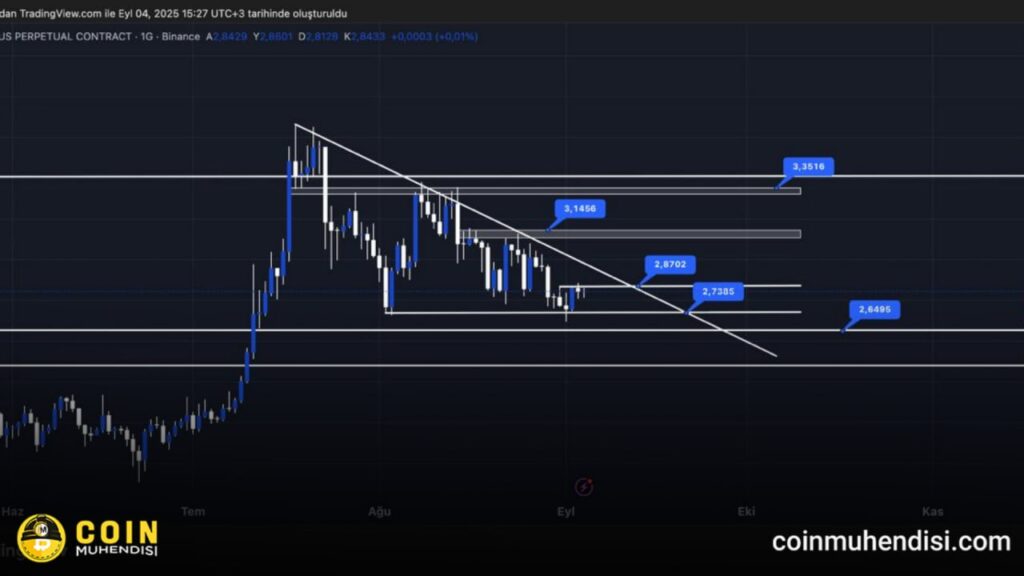 Yeni bir ATH yaptıktan sonra düzeltme sürecine giren XRP, bu hareketin ardından yükseliş momentumunu bir miktar kaybetmiş görünüyor. Genel piyasanın yönsüz seyri de yatırımcı güvenini zedelerken, yeni bir yükseliş döneminin başlaması bekleniyor. 2.73$ desteğinin korunması pozitif bir görünüm sağlıyor. Kısa vadede ise ilk olarak 2.87$ üzerinde kapanış yapması gerekiyor. Bu seviyenin aşılması, düşüş trendinin sonlandığını gösterebilir. Ancak asıl kritik direnç 3.14$ seviyesinde bulunuyor. Bu bölgenin kazanılması halinde XRP’nin yeniden güçlü bir yükseliş momentumu yakalaması beklenebilir.