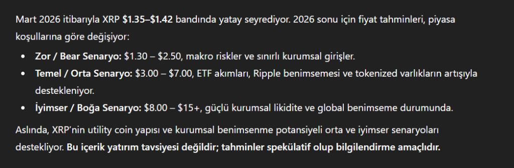 Mart 2026 itibarıyla XRP, $1.35–$1.42 bandında yatay seyrediyor. Aslında, bu sakin görünüm, fırtına öncesi sessizlik gibi; yani büyük bir hareketin habercisi olabilir. Ripple’ın regülasyon netliği, ETF akımları ve XRP Ledger üzerindeki tokenized varlıklar ile ODL kullanımı fiyat üzerinde kritik rol oynuyor. İşte dört büyük yapay zekanın 2026 sonu öngörüleri; unutmayın, bunlar spekülatif ve yatırım tavsiyesi değil.