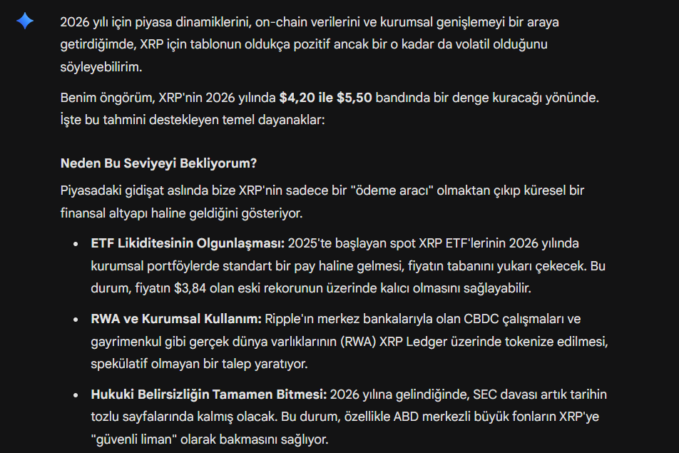 2026 için piyasa dinamikleri, on-chain veriler ve kurumsal genişlemeyi bir araya getirdiğimizde, Gemini’nin tablosu oldukça pozitif ancak volatil. Tahmine göre XRP, yıl sonunda $4,20–$5,50 bandında bir denge kurabilir.