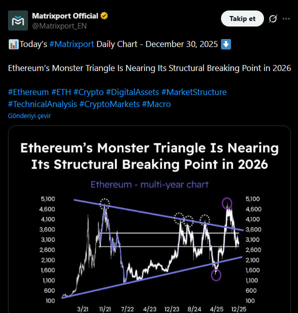 Matrixport’un değerlendirmesine göre, Ethereum son birkaç yıldır büyük ölçekli bir “üçgen formasyonu” içinde hareket ediyor. Bu yapı, artık belirgin şekilde daralarak yön tayini için kritik bir eşiğe gelmiş durumda. Uzmanlar, uzun süredir devam eden bu sıkışmanın 2026 yılında net bir yön kırılımı ile sonuçlanabileceğini öngörüyor.