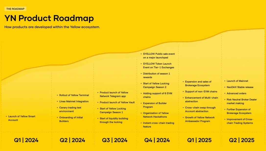 - 2024 Q3: Yellow Network Telegram uygulamasının lansmanı, Yellow Vault ürün lansmanı, Yellow Kilitlenme Kampanyası Sezon 1 başlangıcı, Kilitlenme yoluyla likidite oluşturma başlangıcı