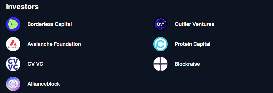 Yatırımcılar: Outlier Ventures, Avalanche Foundation (AVAX), Borderless Capital. Seed ve private round’lar ile toplam fon ~3–4 milyon USD civarında.