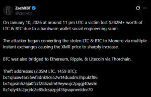 Blockchain dünyasında yankı uyandıran büyük çaplı bir güvenlik ihlali, kripto para piyasalarında ani ve sert fiyat hareketlerine neden oldu. Zincir üstü analizleriyle tanınan ZachXBT’ye göre, 10 Ocak 2026 tarihinde gerçekleşen donanım cüzdanı kaynaklı bir sosyal mühendislik saldırısında 282 milyon doların üzerinde Bitcoin ve Litecoin çalındı. Çalınan fonların kısa sürede Monero’ya dönüştürülmesi ise XMR fiyatında dikkat çekici bir yükselişi tetikledi.