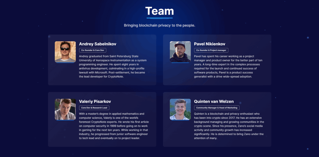 Zano’nun arkasındaki en önemli isim Andrey Sabelnikov (Zoidberg)’tur. Kendisi, gizlilik odaklı ilk protokol olan CryptoNote’un baş geliştiricisidir. CryptoNote bugün Monero ve birçok gizlilik odaklı projenin temelini oluşturur. Diğer kurucu ortaklardan biri de Pavel Ravaga olup, stratejik yönlendirme ve topluluk gelişiminde önemli rol oynamıştır. Ekip, Boolberry ve Zano gibi projelerle gizlilik odaklı blockchain geliştirmede uzun yıllara dayanan deneyime sahiptir.