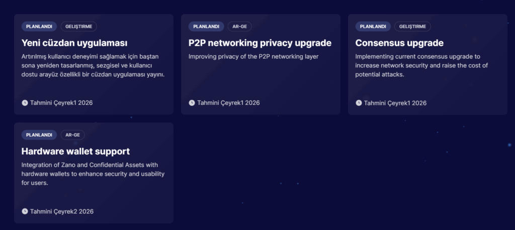 - Donanım Cüzdanı Desteği (Q2 2026): Zano ve Gizli Varlıklar için donanım cüzdan entegrasyonu.
