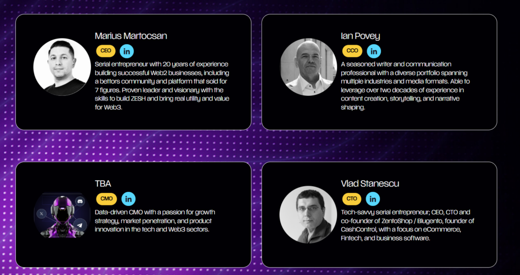 Zesh AI ekibi ağırlıklı olarak Web2 geçmişine sahip, daha sonra Web3’e geçiş yapmış isimlerden oluşur.
