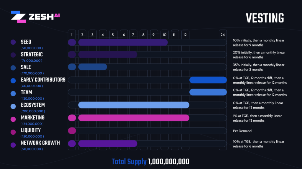 Zesh AI Layer ($ZAI) token dağılımı, ekosistem büyümesini desteklerken aynı zamanda piyasa likiditesini koruyacak şekilde dengeli bir modelle hazırlanmış. Arz tek bir grupta yoğunlaşmıyor. Bu, uzun vadeli sürdürülebilirlik açısından önemli bir detay.