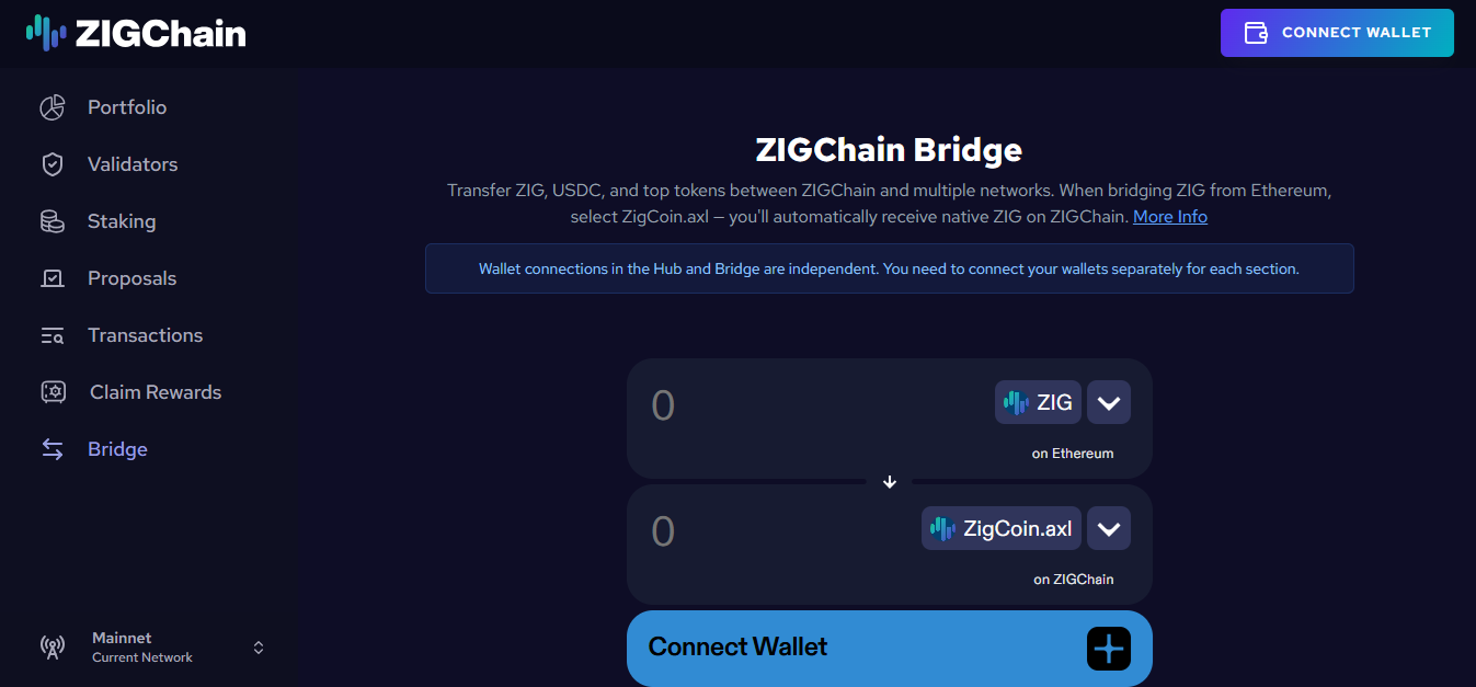 • ZIGChain Hub: Portföy yönetimi, staking, yönetişim ve zincirler arası köprü işlemleri için kullanıcı dostu arayüz.