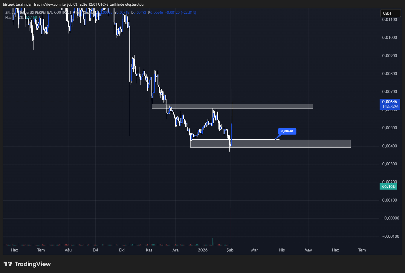 Günlük grafikte 0,00610 $ seviyesi kritik bir destek olarak ön plana çıkıyor. Bu bölgenin üzerinde günlük kapanış yapması durumunda ZIL yapısını çevirmiş olacak ve yükselişin devam etme ihtimali güçlenecek. Hacimdeki artış da fiyata ek momentum sağlayabilir. Öte yandan, olası geri çekilmelerde ilk destek bölgesi 0,0044 $ olarak izleniyor; fiyat bu seviyeye düşerse tepki alması beklenen nokta burası olacak.