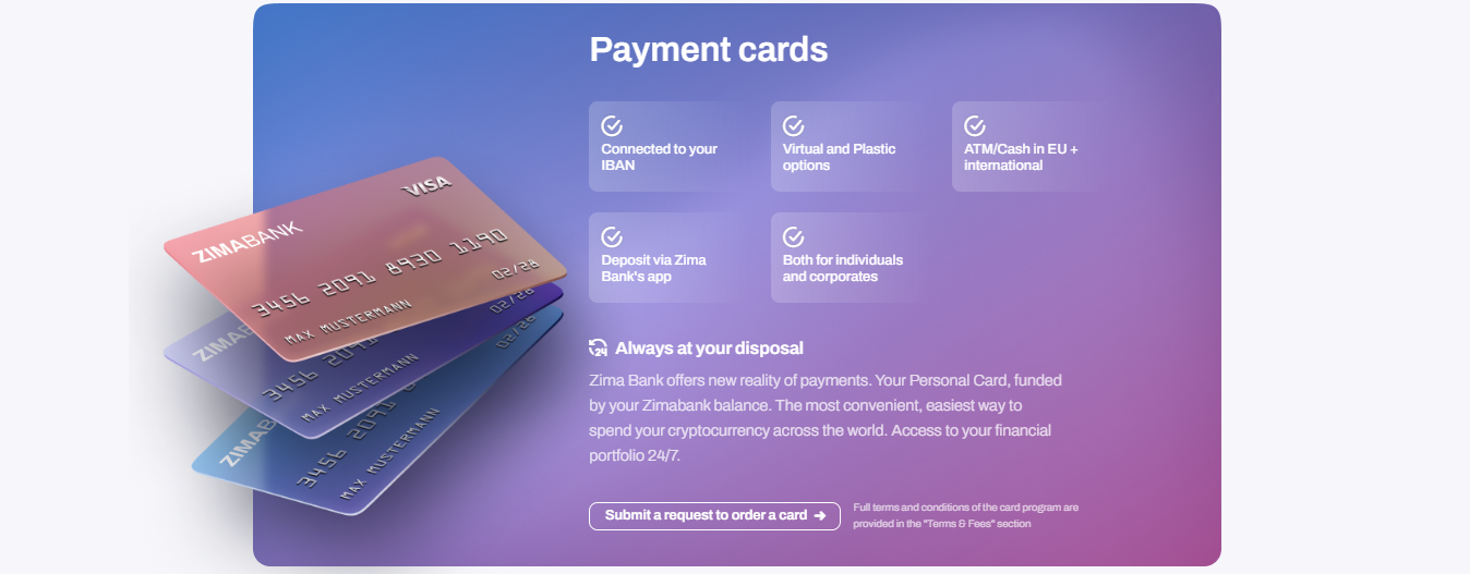 ZimaBank kullanıcıları, hesaplarına bağlı sanal veya fiziksel debit kartlar edinebilir. Bu kartlar: